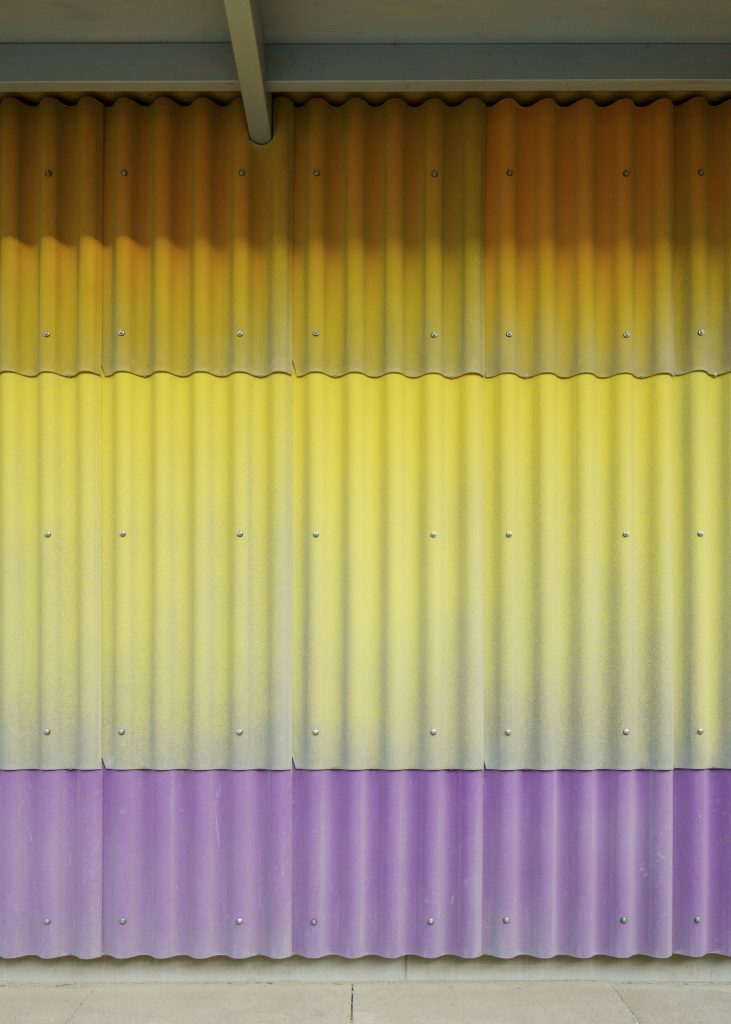 Die Farbgestaltung verstärkt diesen Eindruck von Bewegung und Leichtigkeit. In sanften Verläufen treffen Lila, Gelb, Orange und Blau aufeinander – ein Spiel aus Struktur und Farbe, das gemeinsam mit den Kindern und Jugendlichen des Freizeittreffs entwickelt wurde. So entsteht eine persönliche Handschrift, die dem Haus Identität verleiht und Zugehörigkeit schafft.