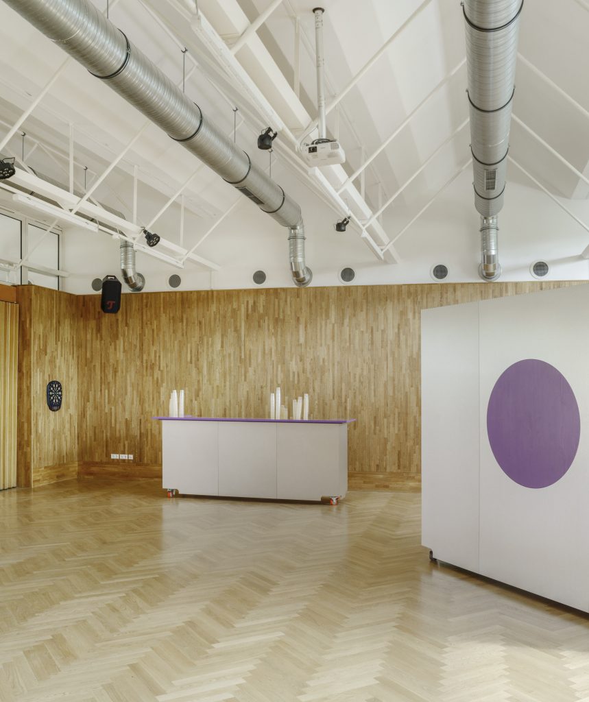 Flexible Einbauten ermöglichen wandelbare Nutzungen: als Bar, Bühne, Tisch, Bibliothek oder Stauraum. Der zentrale Raum bleibt offen, lässt sich immer wieder neu konfigurieren und bietet Platz für große Veranstaltungen ebenso wie für kleine Treffen. Materialien, Lichtführung und Raumproportionen schaffen ein einladendes, inspirierendes Ambiente, das Begegnung und Kreativität fördert.